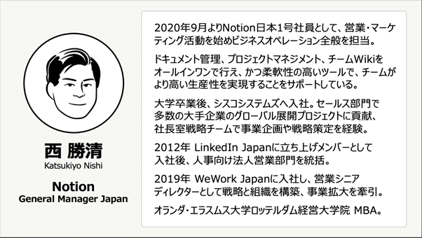 ーーーそしてNotion日本1号社員/ゼネラルマネージャーの西勝清さん!