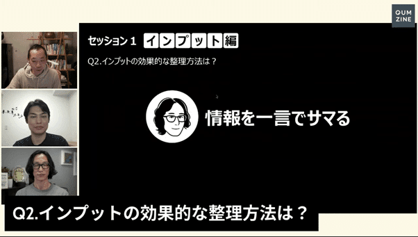 角:続いて、“インプットの効果的な整理方法は?”ということなんですけど、これに対しての村上さんの回答がこちら、“情報を一言でサマる”。