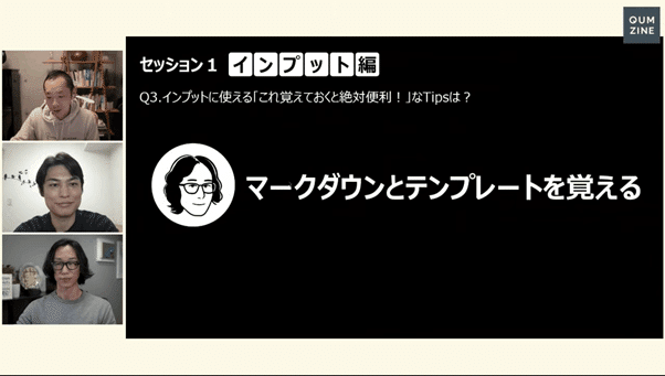 角:続いて、“インプットに使える「これ覚えておくと絶対便利!」なTipsは?”ということなんですけど、これに対しての村上さんの回答がこちら、“マークダウンとテンプレートを覚える”。
