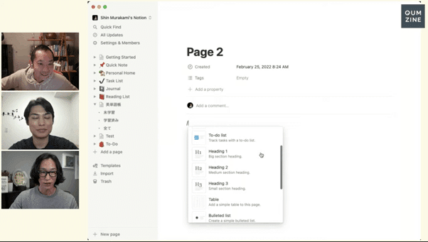 村上:Notionではとりあえず「/」を押すとこうやって全てのできることが出てくるんですよ。で、たとえばこうやって「見出し1」を選んだらいいんですけど、そうしなくても「# 」を入力すると見出し1の装飾になるんですね。こういう感じで、「/」を押して全てのメニューから選ばなくても、マークダウンという記法を使えば作業をショートカットできるんです。