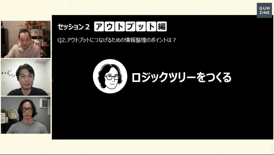 続いてこちら、“アウトプットにつなげるための情報整理のポイントは?”ということなんですけど、これに対しての村上さんの回答がこちら、“ロジックツリーをつくる”。