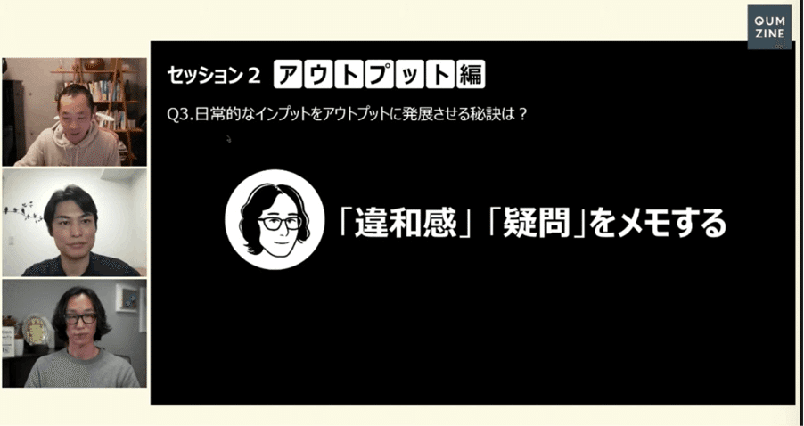 角:続いてこちら、“日常的なインプットをアウトプットに発展させる秘訣は?”ということなんですけど、これに対しての村上さんの回答がこちら、“「違和感」「疑問」をメモする”。