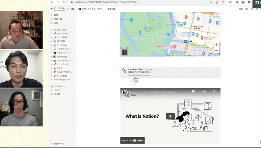 西:あと、いろんなものが埋め込みできます。MiroやFigmaとかTwitterを埋め込むこともできます。Slackも埋め込めるので、「Slackで話したアレは?」となりそうなものはここに埋め込んでおけば大丈夫です!