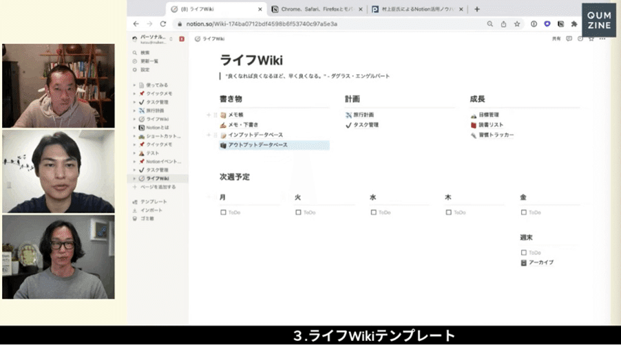 それからテンプレート。テンプレートも沢山用意されているんですけど、僕が一番好きなのはLife Wiki。家族でいった旅行の予定表とか、色々入れてます。最近は個人でもテンプレートを公開されている方がいらっしゃいますよね。