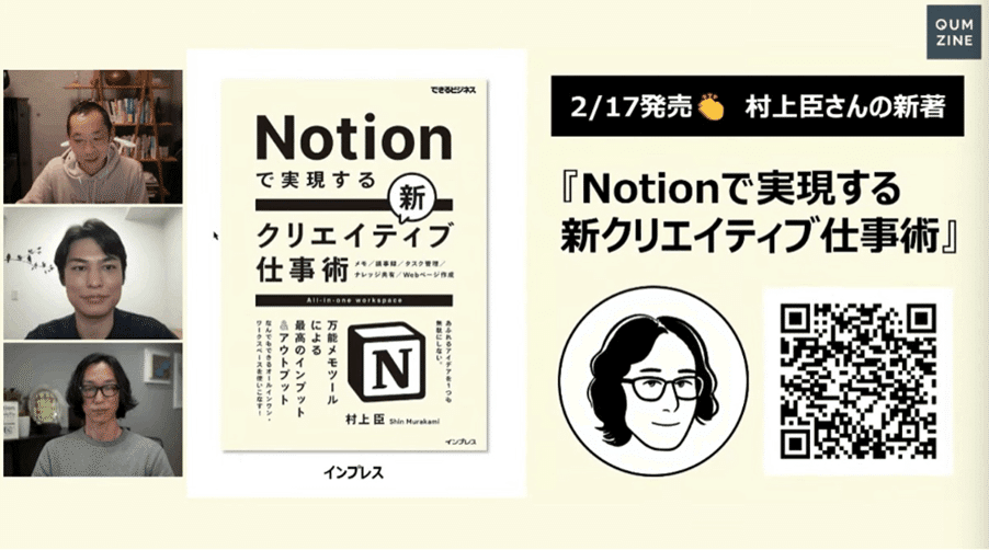 2月17日に発売された村上臣氏の新著『Notionで実現する新クリエイティブ仕事術』。その発売を記念したフィラメント/QUMZINEとのコラボイベントが2022年3月1日に開催されました!