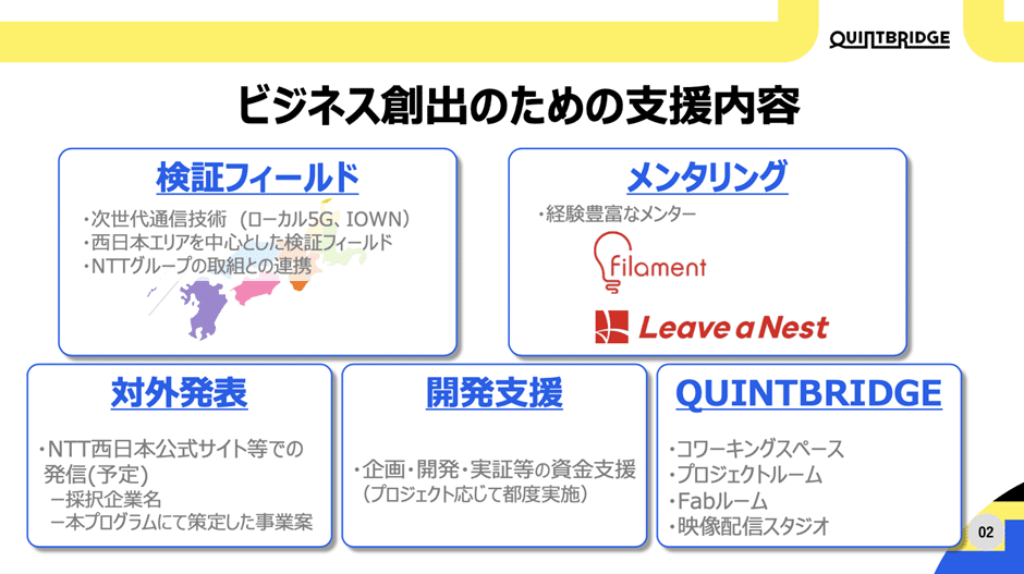 西日本電信電話株式会社(以下、NTT西日本)が大阪京橋に開設した共創空間「QUINTBRIDGE(クイントブリッジ)」で実施される短期集中の未来共創プログラム。本プログラムにより、西日本のオープンイノベーションシーンとエコシステムを生み出します。