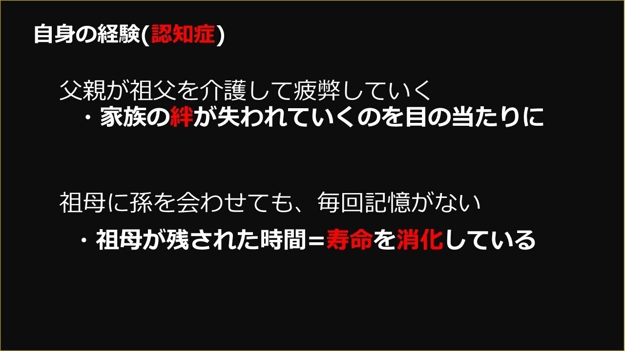 また、私自身が父親になってからは、孫を祖母に会わせても、認知症によって毎回記憶がないということがあり、そこで祖母が残された時間、寿命が消化されているという心の痛みを抱えました。これを基に、社会課題解決のサービスを立ち上げようと決意しました。