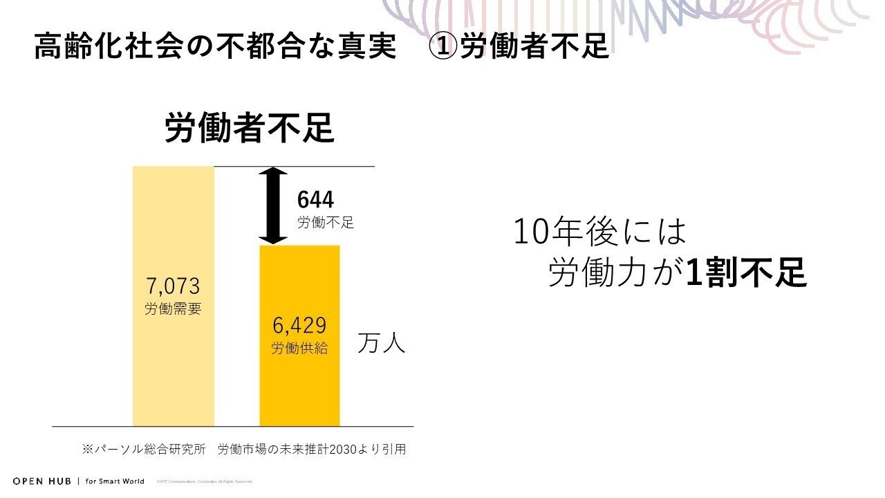二つ目として、高齢化社会においては労働者不足が挙げられます。パーソル研究所のレポートによると、2030年には労働者が600万人ほど不足すると言われています。10年後には労働力が1割不足することになり、これは危機的な状況かと思います。