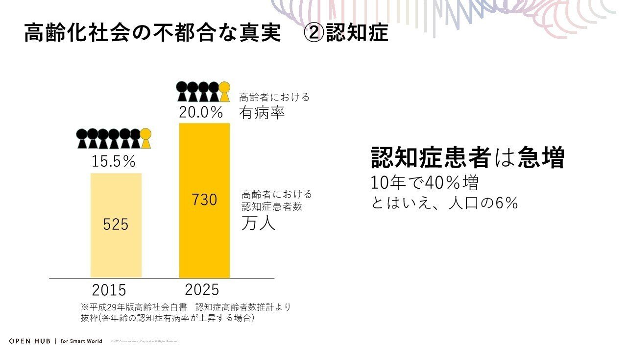 さらには、認知症患者の急増も予想されています。2015年には525万人だったものが、2025年には730万人となります。これは10年で40%増加することとなり、その数は人口の6%に値します。