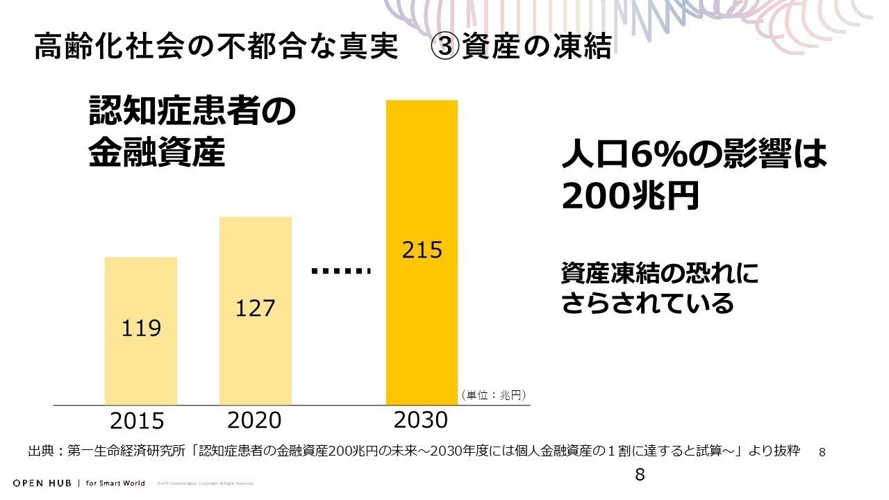 認知症になると資産凍結の恐れにさらされるといわれていますが、人口の6%となると200兆円の金融資産が凍結される恐れがあります。2030年には我々が想像しないような時代に突入していくのではないかと考えております。このような自己体験と社会的な変化からソリューションを組み立てました。