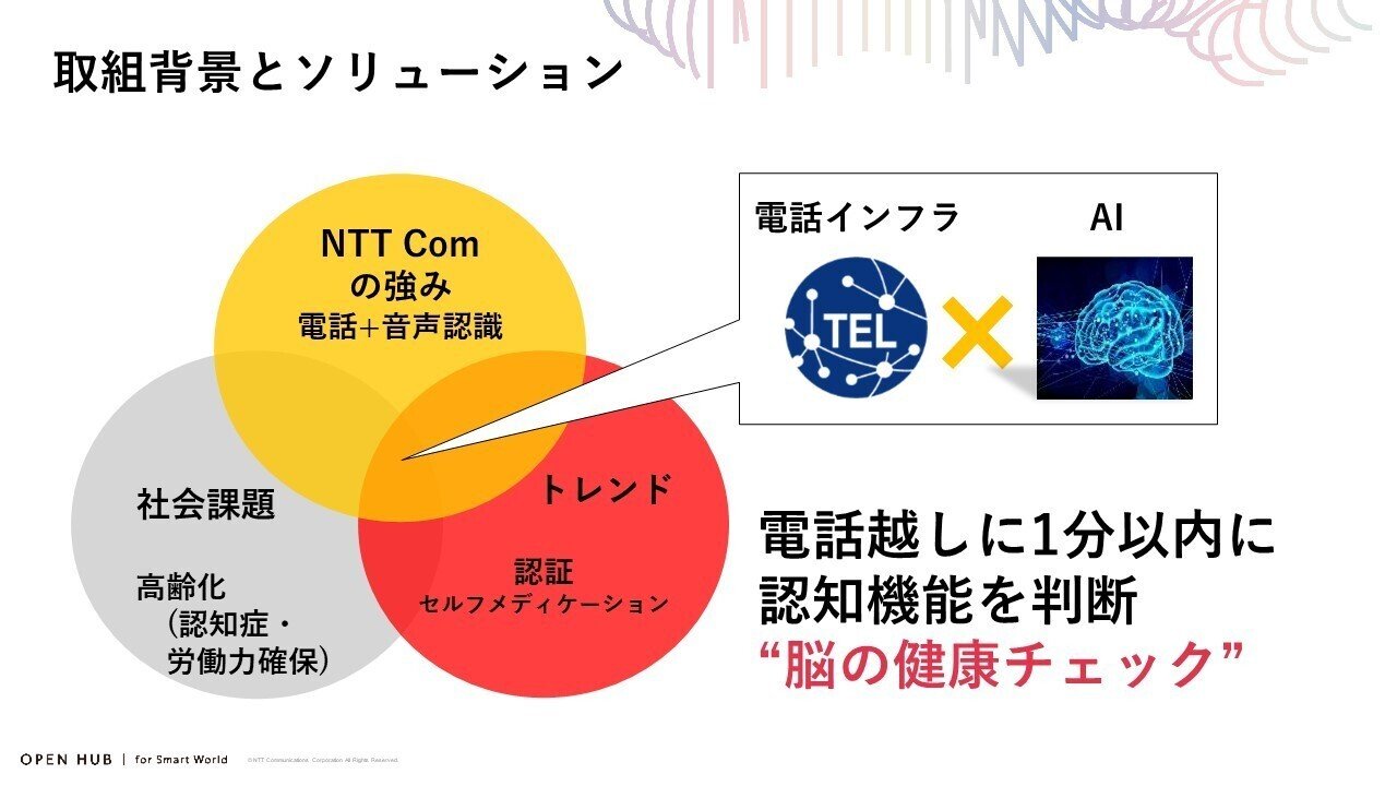 NTT Comの「強み」として電話や音声認識というコア技術、そして「社会課題」として認知症や労働力確保といった課題、「トレンド」として自分の健康状態を自分で確認しようという動きであるセルフメディケーション。「強み」「社会課題」「トレンド」これら3つの交点にビジネスを見出し生まれたのが、電話のインフラとAIを掛け合わせることで、電話越しに1分以内で認知機能を判断する「脳の健康チェック」というサービスです。