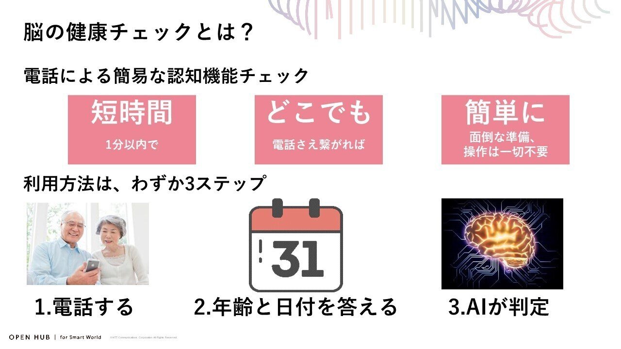 このサービスは、短時間でどこでも簡単に脳の認知機能をチェックできるもので、電話をして、年齢と日付を答えていただくだけでAIが判定してくれます。