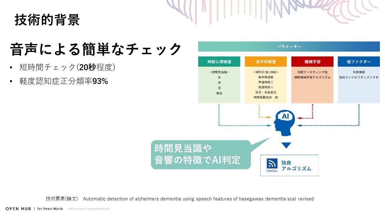 パートナーである日本テクトシステムズ社の技術を採用し、発話する際の声の揺れや言いよどみ、遅れなどを要素分解したうえで、特徴量としてとらえてAIが解析しています。実際に認知症と診断された方の行為のデータを基に、機械学習モデルを作成しています。これは臨床研究もされている技術です。