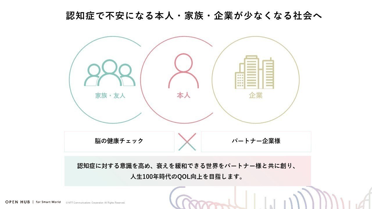 今回のプロジェクトのコンセプトとして、認知症で不安になる本人・家族・企業が少なくなる社会を目指して活動しています。パートナーの企業様は家族・友人、本人、企業のそれぞれの軸でサポートできるようなアセットをお持ちです。それらを掛け合わせることで、認知症に対する意識を高め、衰えを緩和できる世界をパートナー様とともに作り、人生100年時代のQOL向上を目指していきたいと考えています。