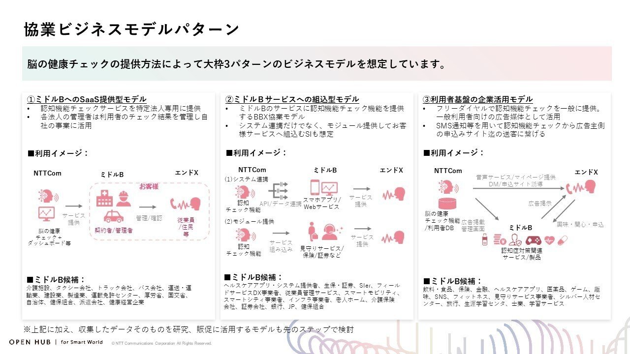 まず1つ目は「ミドルBへのSaaS提供型モデル」、2つ目は「ミドルBサービスへの組込型モデル」、3つ目として「利用者基盤の企業活用モデル」です。1つ目は例えばタクシー業界の方に専用のフリーダイヤルを貸し出し、従業員の方に使っていただくようなモデルを考えています。2つ目は、自社で実装しているスマートフォンアプリに脳の健康チェックの機能を実装していただくイメージを考えています。3つ目は、個人の方がかけていただいて、健康について興味を持ったり、脳の機能について不安を持った方々に対して、CMを提供することで、困っている個人とサポートいただける企業をおつなぎするというビジネスです。