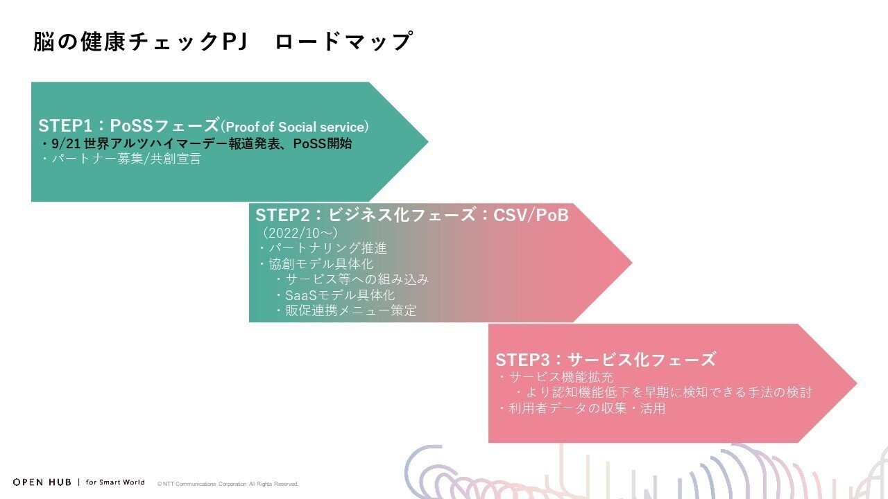 まずSTEP1として、9月21日に報道発表をさせていただきました。我々のプロジェクトの中ではPoSS(Proof of Social Service)と位置づけ、脳の健康チェックというソーシャルサービスが世の中に受け入れられるのかということを確認しています。あわせて、パートナーの募集や共創の宣言をします。続いて、STEP2として、既にご賛同いただいているパートナ―と想定した協業モデルの具体化として、各企業の意見を組み込みながらサービスに仕立てていきます。STEP3では、サービス化フェーズとしまして、もっと早期の段階で検知できないか検討したり、無償提供サービスでご利用いただいた利用者データを収集しながら、サービスの向上に向けて検討をしていきたいと思っています。