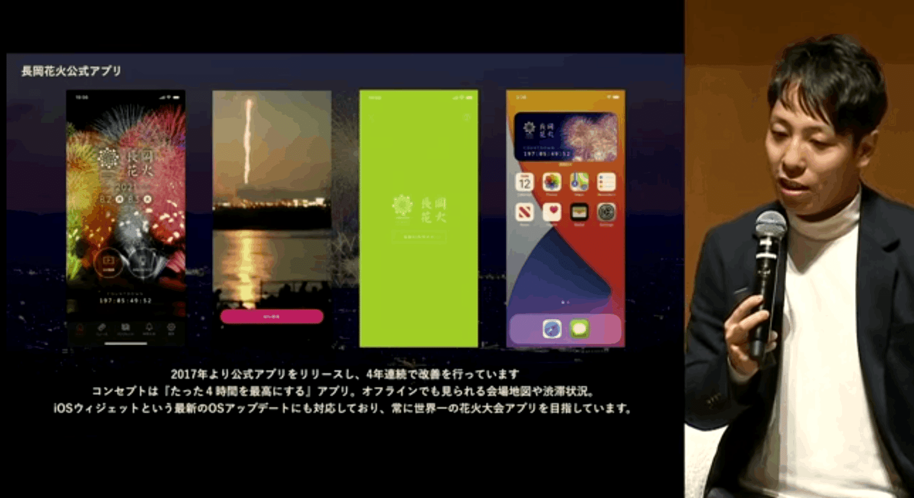 弊社で実際に行っていることを2つ挙げます。1つは長岡花火のアプリです。長岡花火は100万人が訪れるイベントなので、人が来すぎて携帯の電波が通じないことがあります。そこで、事前にダウンロードしておけばいつどの花火が打ちあがるかオフラインでもわかるというアプリを作りました。デジタル化を進める中で気づいたことは、デジタルを使うことはもちろん大事なんですけど、一番の目的は地域をどう良くするということなので、必要であればデジタルかそうでないかにかかわらずやることが重要だということです。