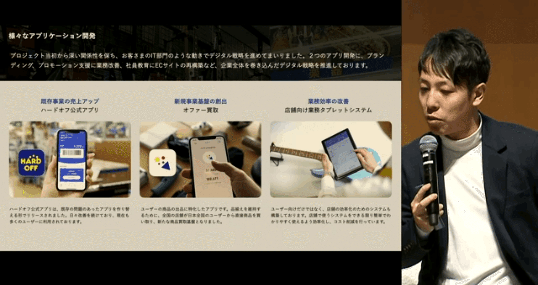 2つ目は、全国に1000店舗ある新潟発のハードオフさんです。3つほどアプリ作っていまして、1つは、そのハードオフさんのお店にユーザーさんが来る公式のアプリ。もう1つは、買い取ってほしい人が製品を写真に撮って、ハードオフの店員がオークション的に値段をつけてくれる『オファー買取』というアプリ。そして、店員さんが買い取った商品を登録してデータベース化するタブレット向けアプリです。実は、僕はDXと呼ばれるものは「既存の事業の売り上げを上げる」「新規の事業をデジタルで作っていく」「生産性を上げる」の3つしか存在しないと思っています。この3つすべてをご一緒させていただいて、その上でウェブサイトをはじめとしたデジタルに関することを全部ご一緒することも行っています。他にも地域のIT人材育成も実施しています。そこでは、「ソフトウェアの地産地消」という概念を大切にしています。地域の課題は、その地域の中で解決すべきということです。雇用の創出もそうですが、地域の課題を地域の人がやることでモチベーションにもつながります。