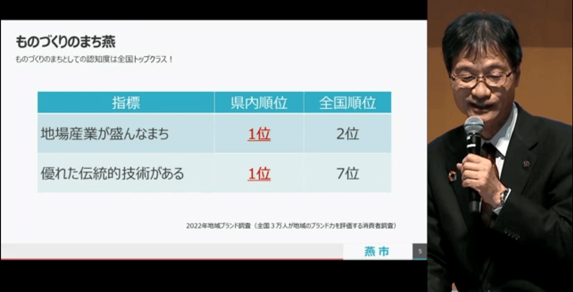 燕市は全国的にものづくりのまちということで認知されています。地域ブランド調査では地場産業が盛んな町として全国でも2位にイメージされています。