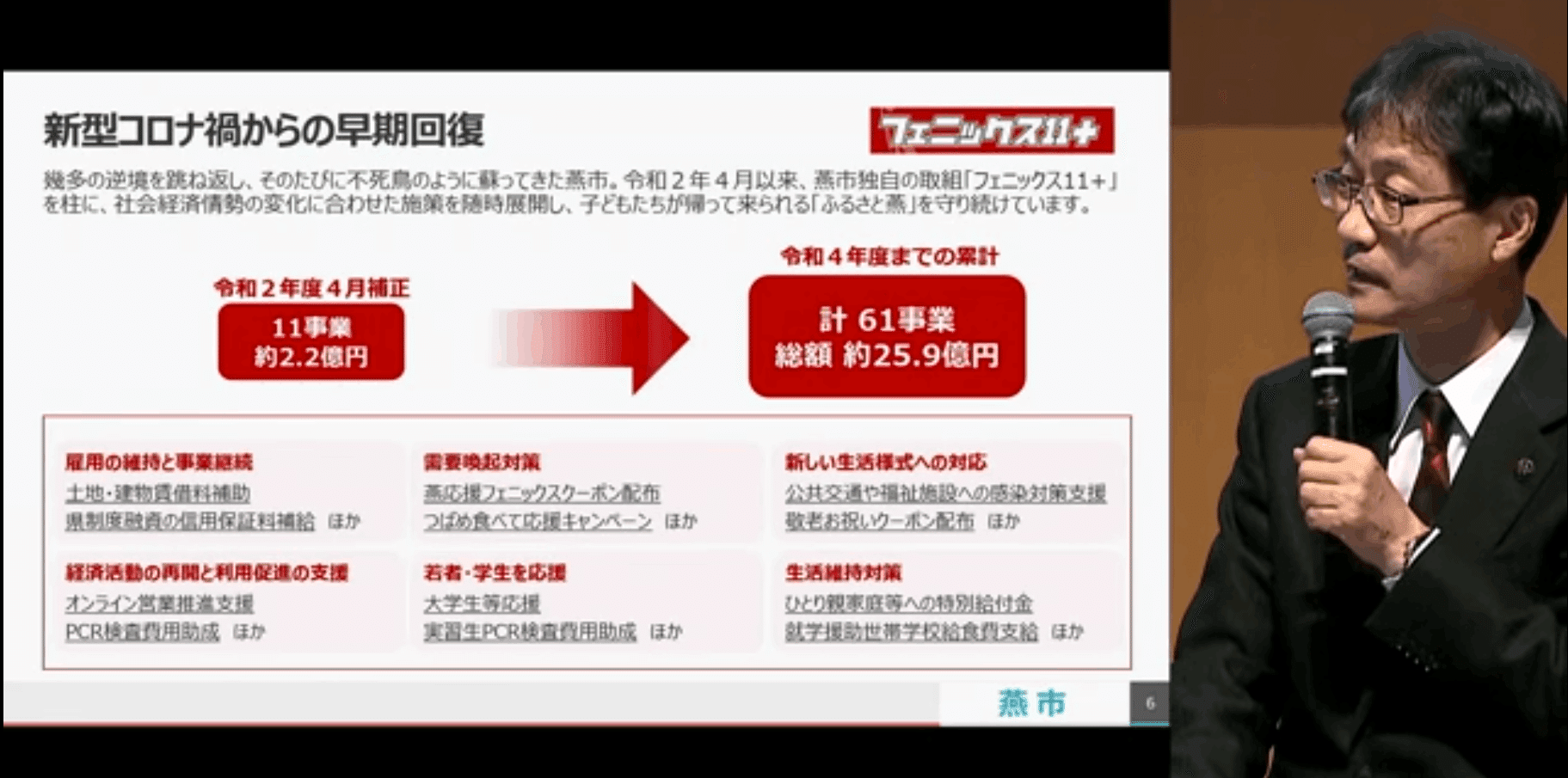 燕市のコロナ対策は「フェニックスイレブンプラス」と名付けました。まさに不死鳥のように、今回の経済危機も必ず乗り越えようということです。イレブンプラスとは、最初に考えた事業が11だったので、 そこをスタートにどんどん状況に合わせて政策を打っていくぞということで、令和2年度のその最初の緊急事態宣言が始まった時に、11の事業を2億2000万円で組みまました。飲食店の家賃補助、飲食店の需要喚起のためのクーポン発行、製造業のオンライン営業に向けた環境整備の補助金、自主的なPCR検査の費用補助というのも始めました。自治体の中では多分初めてだと思います。その中で1番有名だった事業が学生へお米を送ったというものです。