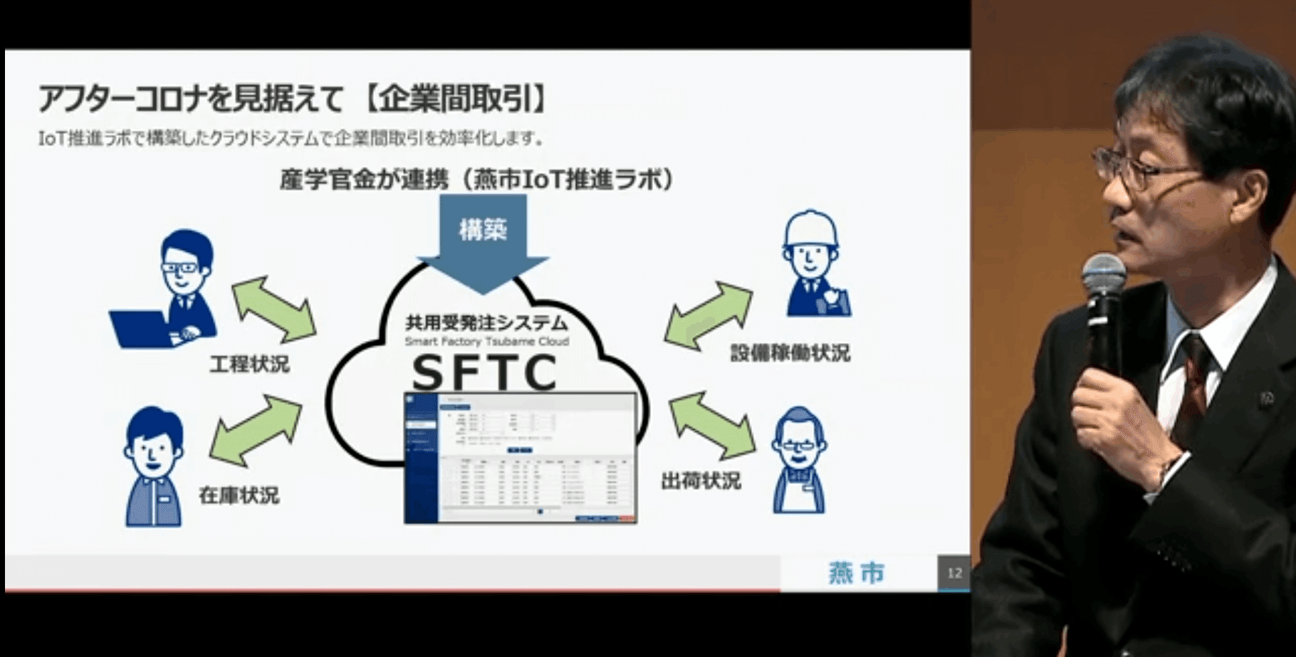 まずは企業間取引の効率化です。燕市には1700社ほど製造業があり、基本的に工程ごとに分業体制を取っていて、工場を転々としながら、1つの製品が出てくるという産業構造になっています。これまで受発注や状況確認をFaxや電話で行っていましたが、これをクラウド上で見られるようにしていきます。SFTC(共用受発注システム:Smart Factory Tsubame Cloud)と名付け、推進プラットフォームには産学官、金融機関にも入ってもらいました。現在10社ほどで動き出しており、仲間を募っております。最近はいろんなテレビで取り上げられ、新潟県代表としてデジ田甲子園にも出ました。