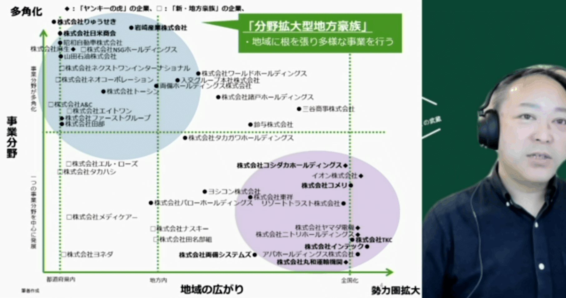 最近の関心ごとの一つに「地方豪族企業」があります。地方の財政が厳しい中、これからの地方はどうしていくべきか考えたときに、行政と地元の有力企業との関係を強くする、あるいは、地元の有力企業が鉄道を引いたり学校を作ったりしてきた歴史に倣って、デジタル分野でその地域の社会インフラに投資をするみたいなことができないだろうかということを考えています。全国に進出するというのは、企業の発展の仕方の一つとしてあるかと思いますが、地方豪族企業は、エリアを拡大するよりはその地域に根付いて、その地域の中で多角化をしています。新潟でいえばNSGさんはその典型例だと思います。その地域の中でいろんな事業に参入し、ネットワークを持ち、雇用も抱え、消費者も相手にしているので、その地域のキープレイヤーだと思うんですね。