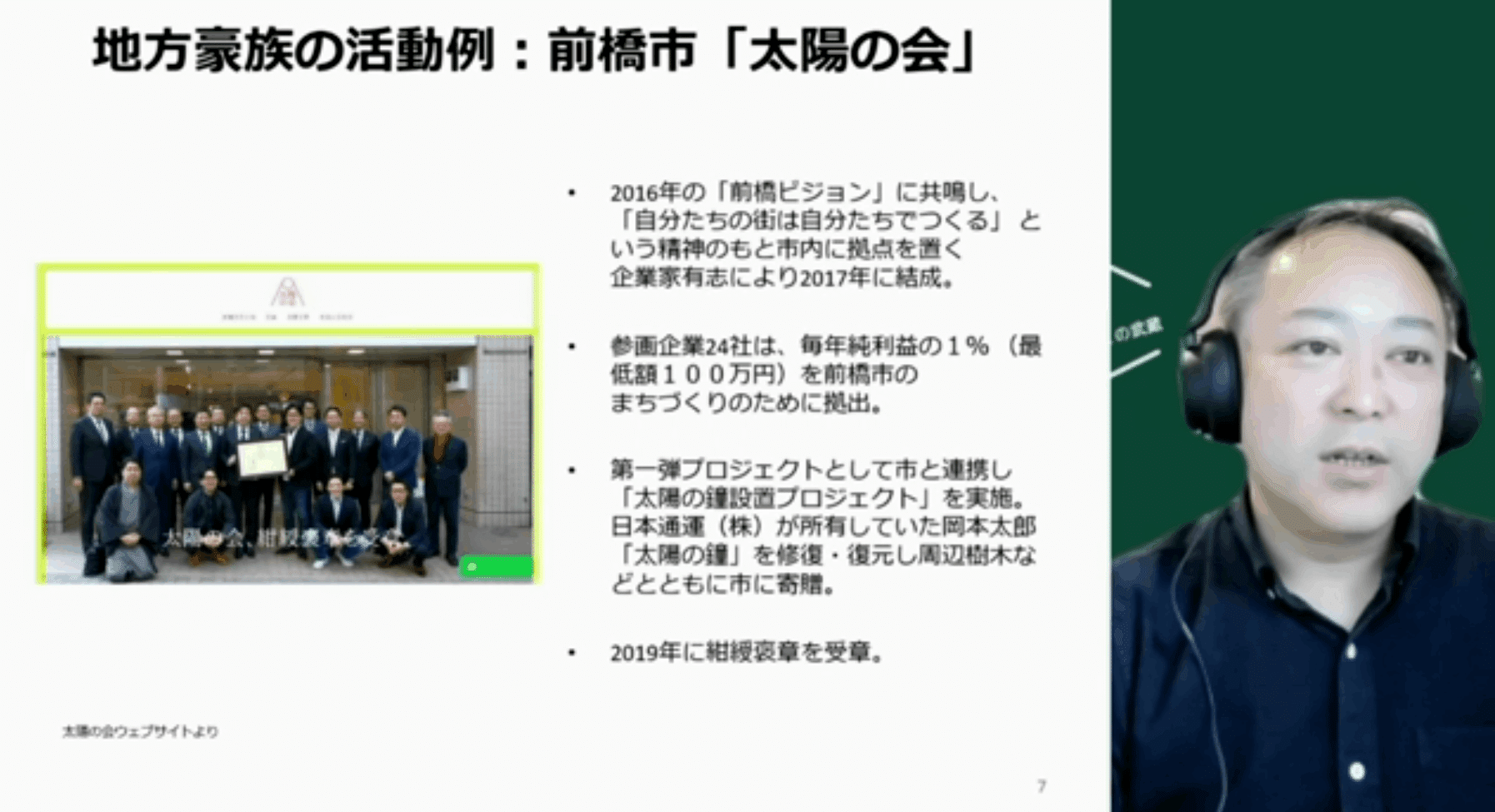 面白い例として、前橋の「太陽の会」をご紹介します。JINSの田中社長が前橋市のご出身だそうで、田中社長が中心となって企業が集まり、毎年の純利益の1パーセントを、前橋の町作りのために拠出しています。これは別にデジタルに投資してるわけではありませんが、例えば岡本太郎の作品を復元して市に寄贈するなど、私がイメージしてることに近いです。