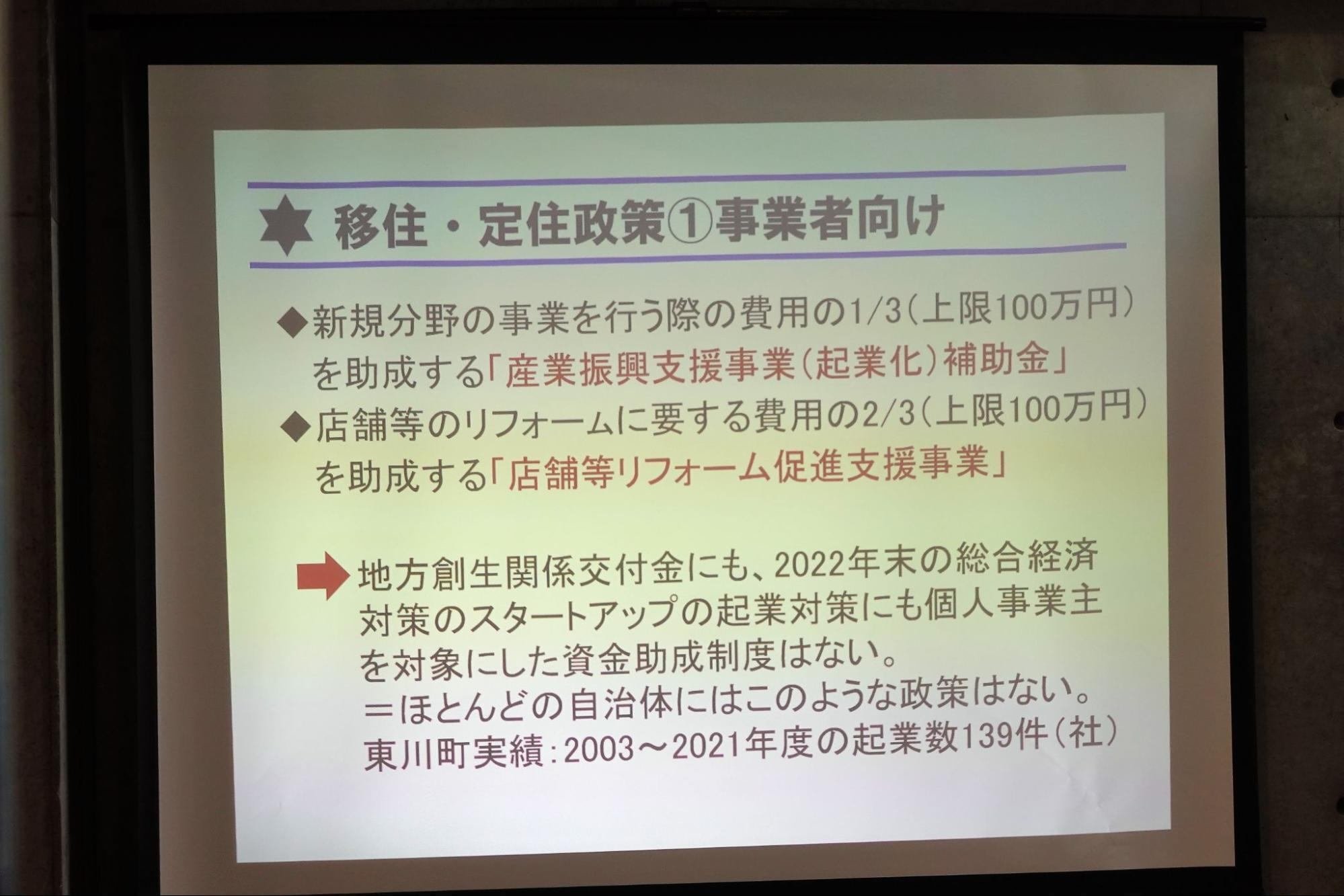 また事業者向けの支援事業として、新規分野の事業を行う際の費用の3分の1(上限100万円)を助成する補助金や、店舗のリフォームにかかる費用の一部を助成するものなどがあります。中村さんによると、種類が多く上限額が非常に高いことが東川町の特徴だといいます。国の地方創成系の交付金は個人事業主が対象外になっており、自治体にもそのための政策がほとんどないのですが、東川町では2003年から2021年度までに139件の制度の利用がありました。これが町の活気にもつながっているとのことです。