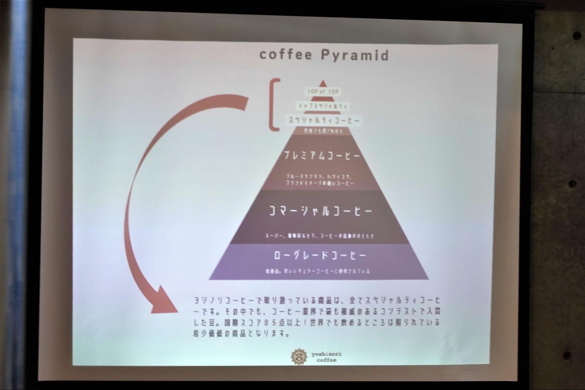 ヨシノリコーヒーはスペシャルティコーヒーの専門店ですが、紗世さんによれば、スペシャルティコーヒーとは、「消費者がおいしいと評価している、満足するコーヒーであること」。風味の素晴らしいコーヒーのおいしさとは、際立つ印象的な風味特性があり、爽やかな明るい酸味特性があり、コーヒーの後味が甘さの感覚で消えていくということだそうです。コーヒーのグレードでスペシャルティコーヒーは上位7%に位置し、これはよく知られているブルーマウンテンのすぐ下に位置付けられているとのことです。中村さんも、一度このコーヒーを飲むと他のコーヒーはもう飲みたくないという感想をお話しされていました。