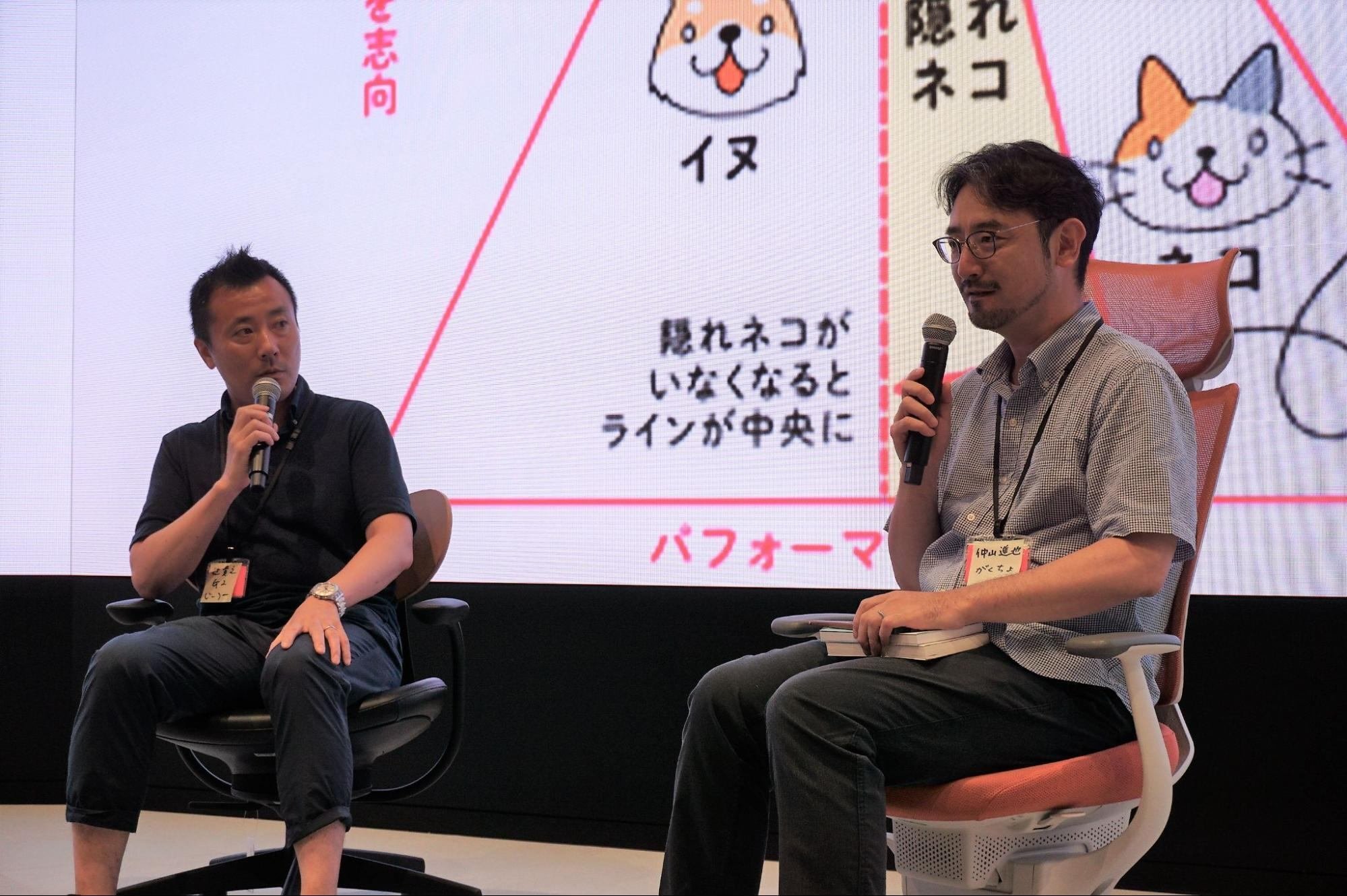 まず登壇したのは今回のイベントのきっかけである『「組織のネコ」という働き方 』の著者であり、”がくちょ”として知られる楽天大学学長の仲山進也さんと進行役の辻貴之さん。『組織のネコ』に関連するイベントが生まれた経緯について話し始めました。
