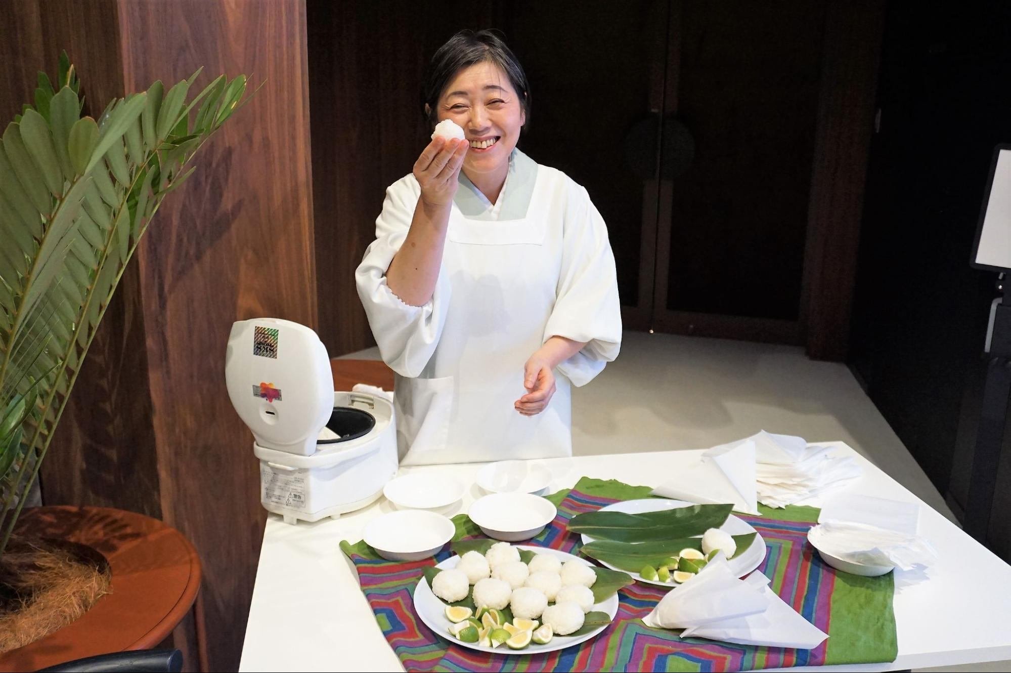 「おにぎり的強み」を発揮したのは、佐賀県で「おにぎり神谷」を開いている神谷よしえさん。「おにぎりを握る場所があればどこへでも飛んでいく」とのことで、このイベントのために自宅のある福岡から炊飯器を下げて来場されました。イベント中、4回に分けてご飯が炊け、多くの参加者が並んで「おいしい!」と言いながら、大分県産のかぼすを絞ったおにぎりをほおばっていました。