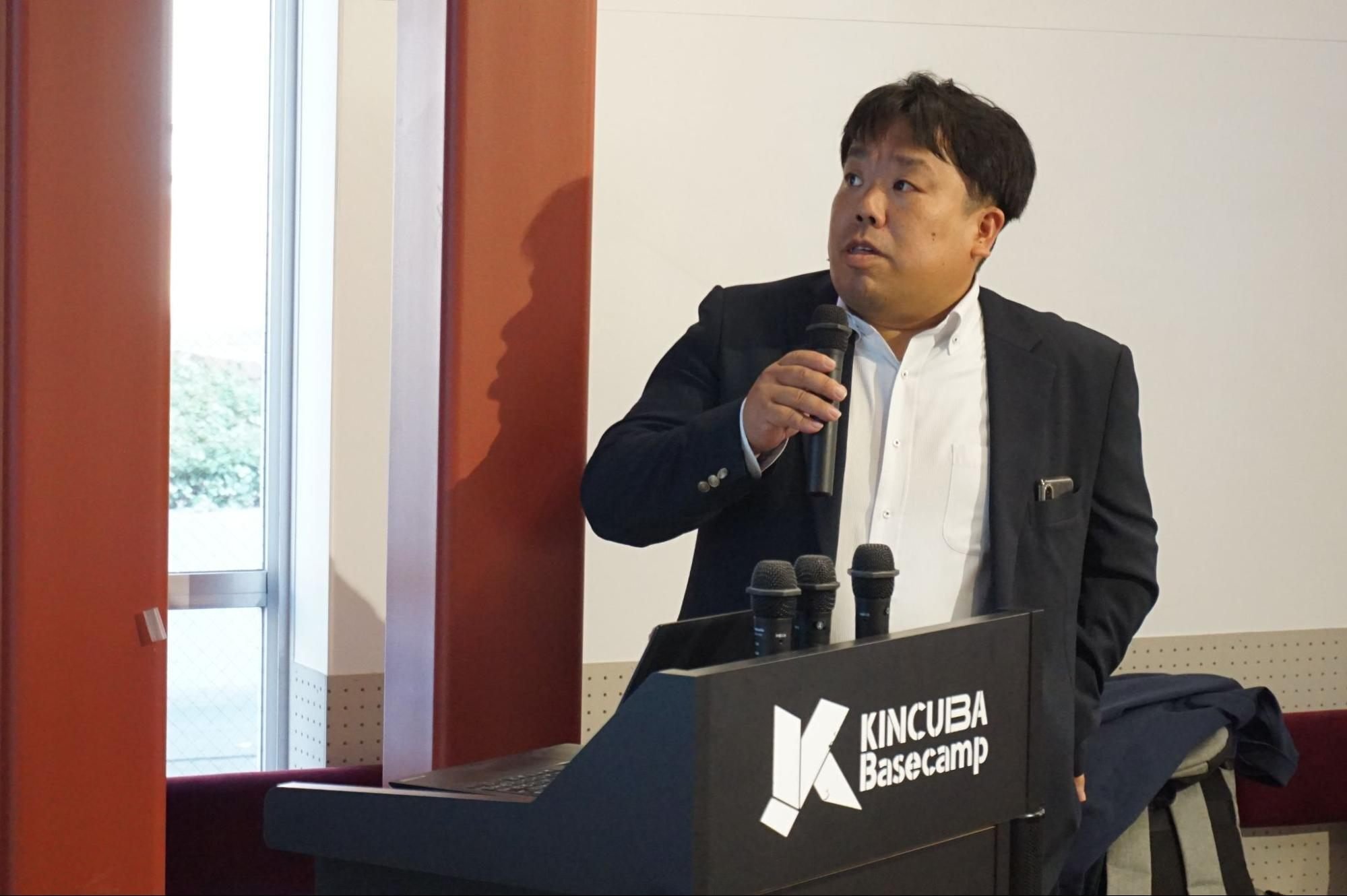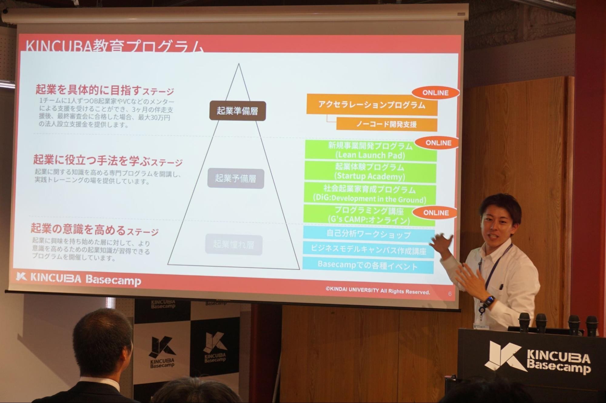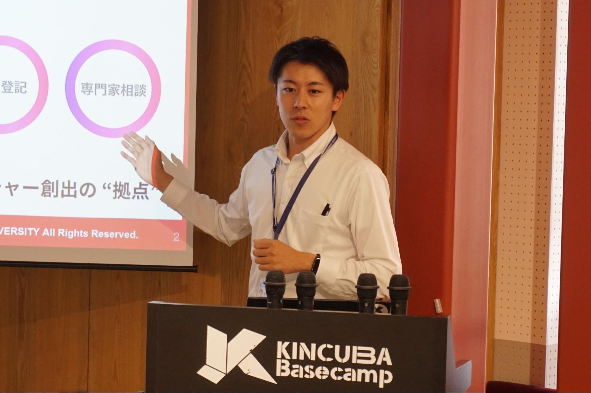 KINCUBAは近畿大学が掲げる「実学教育」に基づいて、研究成果や学問の結果を世の中に貢献できるビジネスに繋げることを目的として始動しました。今回のイベント会場でもある建物の名称は「KINCUBA Basecamp」。24時間利用可能、登記利用もでき、環境面からも起業を支援するインキュベーション施設です。卒業生の起業家を含むメンター制度も充実しており、いろいろな相談を受け付けられる強みがあります。
