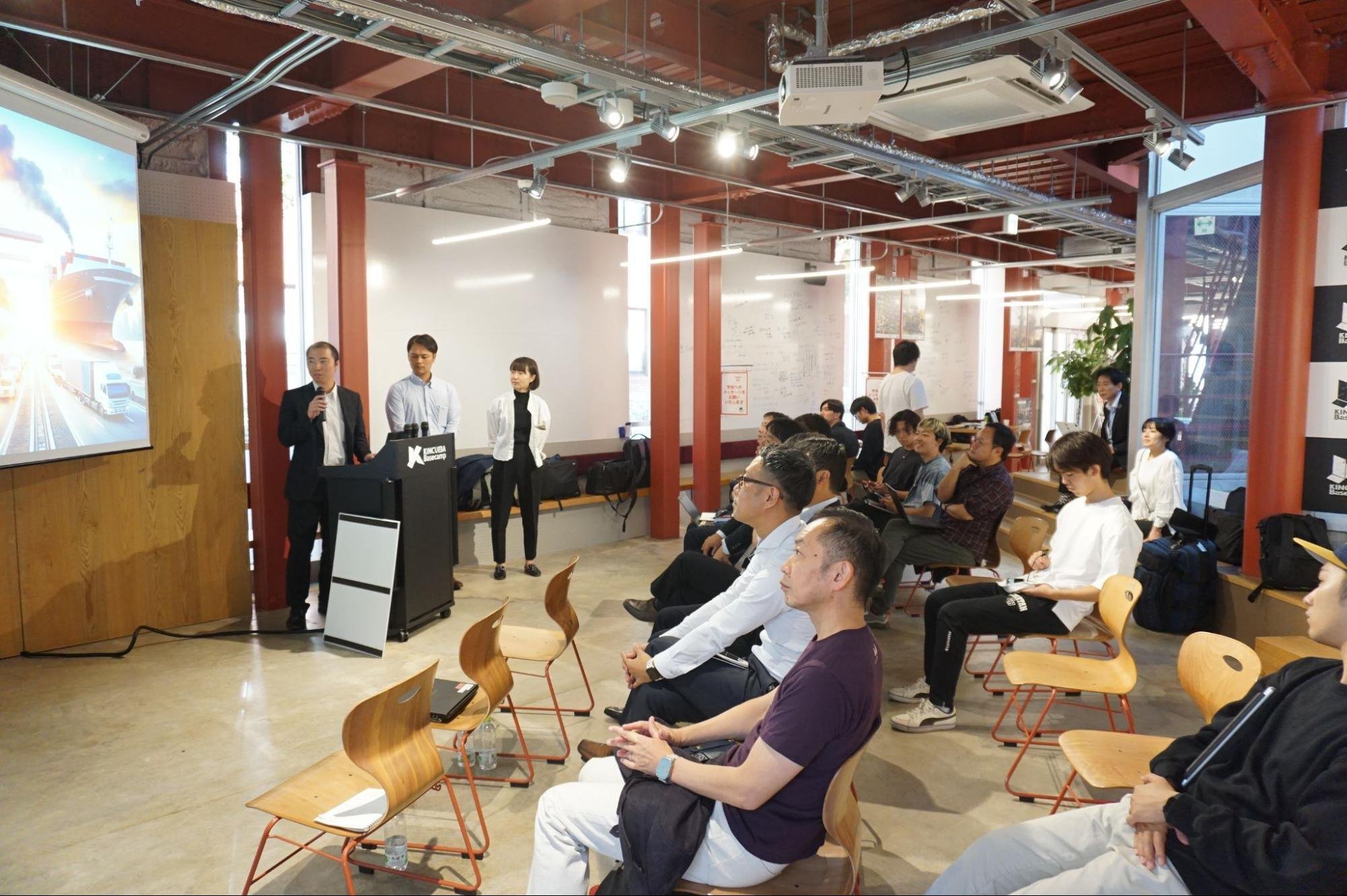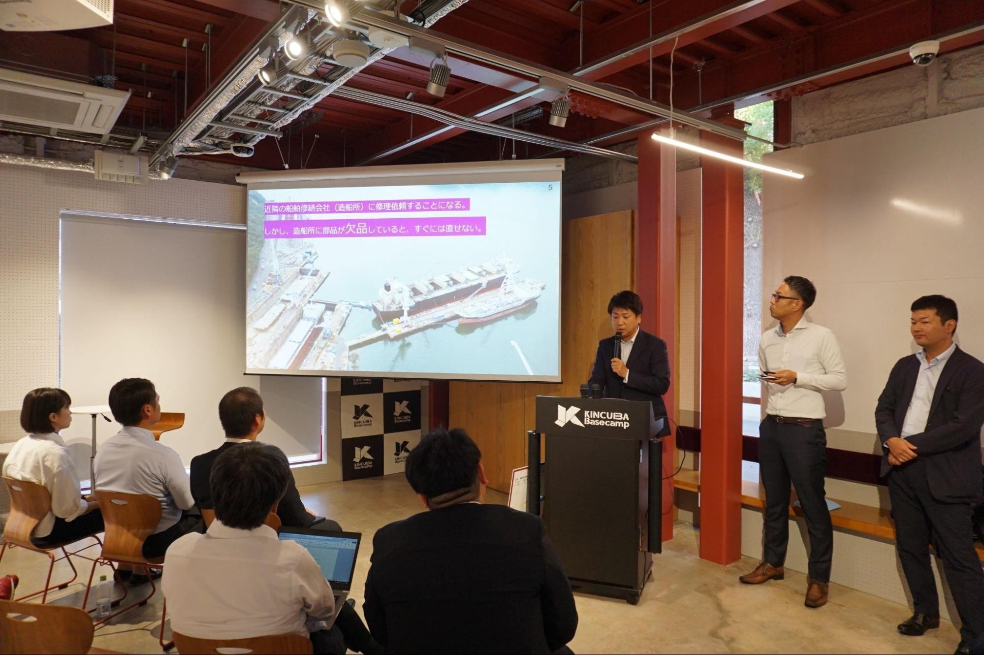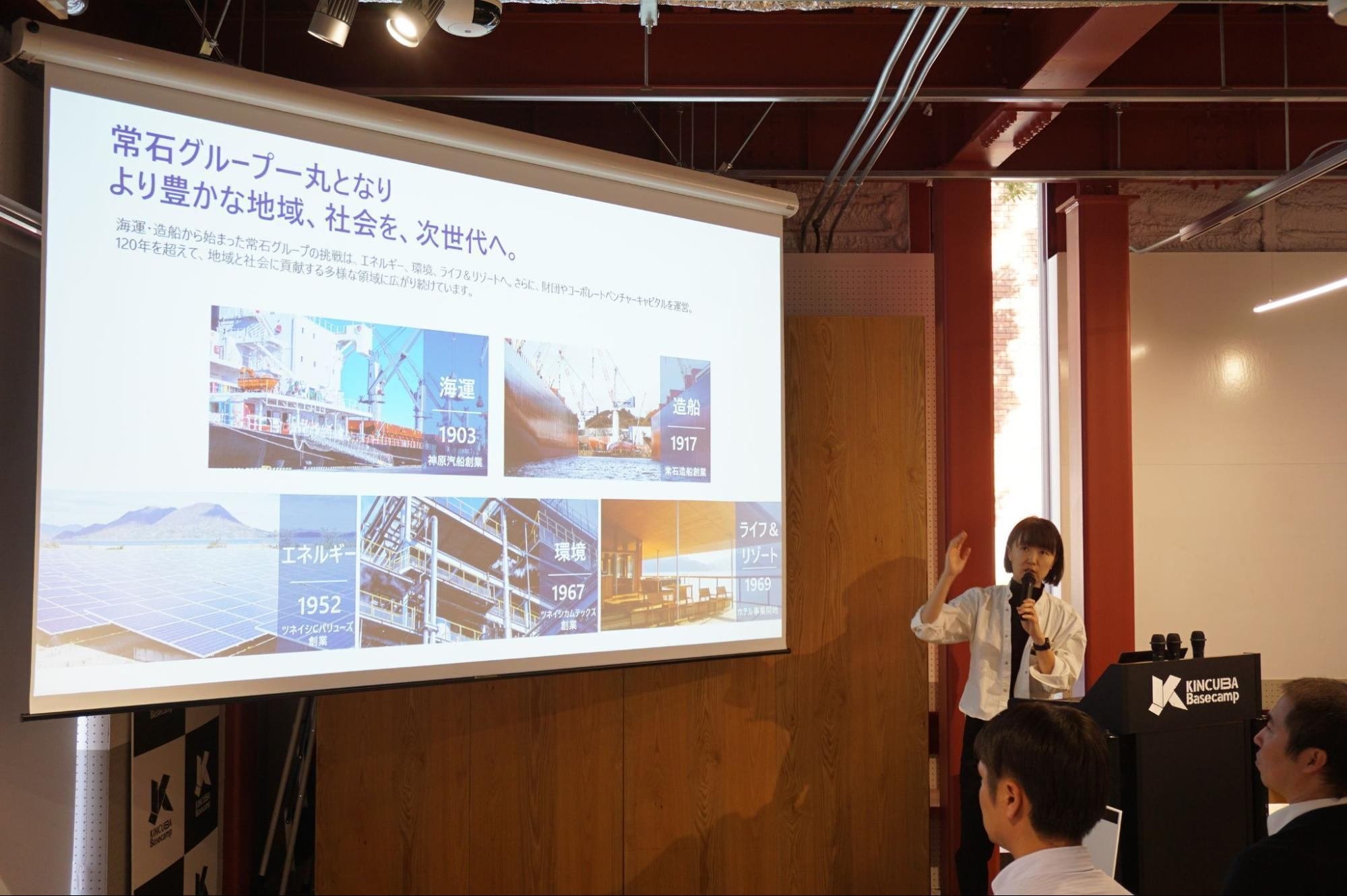 そんな学生起業家支援を積極的に行っている近畿大学が運営するインキュベーション施設「KINCUBA Basecamp」に常石グループと近畿大学の学生起業家のみなさんが集まり、「未来ビジョン交流会〜革新と連携のピッチセッション〜」を実施しました。本イベントでは常石グループの3チームと学生起業家の3チームの計6チームが交互に5分間の事業ピッチと質疑応答を行います。学生と社会人の事業ピッチを互いに聞き、質疑応答を行うことで、新たな化学反応が生まれることが期待されます。