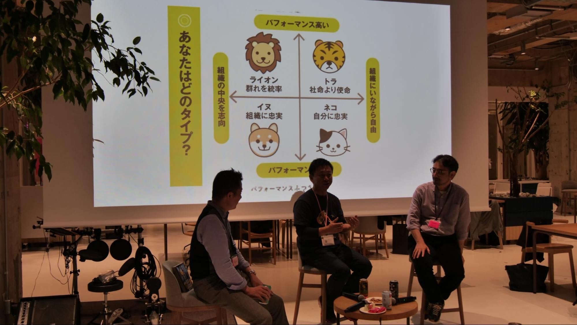 井手:たまたま2年前の昨日に『組織のネコ』を読んだ感想をFacebookにアップしてたんですよね。だから今日この日にイベントに出るということにびっくりしました。自分の場合は、会社員人生の最初はイヌっぽくて適当にふらふら仕事して、気の向くままに仕事や転職をして今の会社で4つ目になります。もともとは一生懸命会社から言われたことをやろうとしてて、イヌの皮をかぶっていたんだけど、本当は組織に忠実じゃないから、そのうちボロが出て、ネコになっていって、我が強いのでトラになって、組織を皆でまとめていくのが楽しくなって、ここ数年はライオンになっちゃっています。