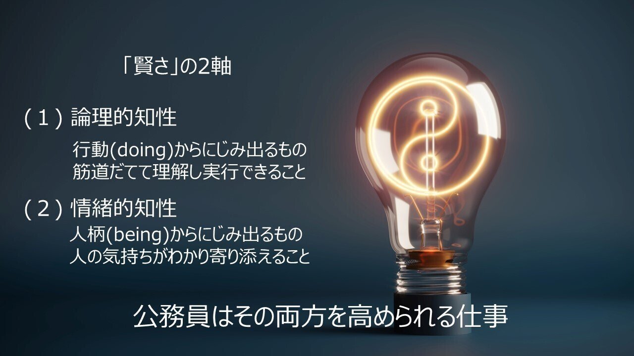 ここで、「賢さ」というものはどういうものなのかについて考えてみます。いろいろな人にも聞いてみたんですが、「論理的知性」と「情緒的知性」の2軸があるように思います。「論理的知性」というのは頭が良いということです。筋道立てて物事を理解して、やることもテキパキしているということ。そして「情緒的知性」は人の気持ちがわかることです。両方とも大事だと思っていますし、公務員はその両方を鍛えて高められる仕事だと、辞めた今こそ思っています。