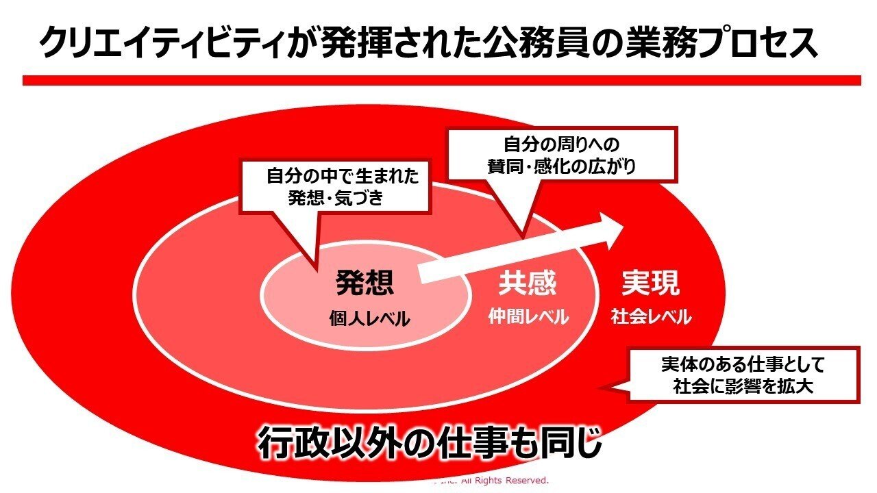 まずは「発想」ですね。何かを改善するとか、市民のためにサービスを考えて発想するところから始まります。自分の中で生まれるもので、ちょっとした気づきのようなものとして個人レベルで起きます。自分の中でとどめておいたら仕事になっていかないので周りに広げて共感してもらわないといけない。自分の周りに広げて賛同を得て、感化してもらって、これはいいと仲間に思ってもらう。そうなると、仲間レベルの仕事になります。そして本当に社会に出てそれを実現するということ。ここまでいくと、実態のある仕事として社会に影響を及ぼしていくことができているといえます。そして公務員の仕事というのは、個人レベルから社会レベルまで伸ばすのが求められることなんだと思いますが、これは行政だけじゃなくて全部の仕事で一緒だと思います。それを学ぶきっかけを作ってもらえたように思っています。