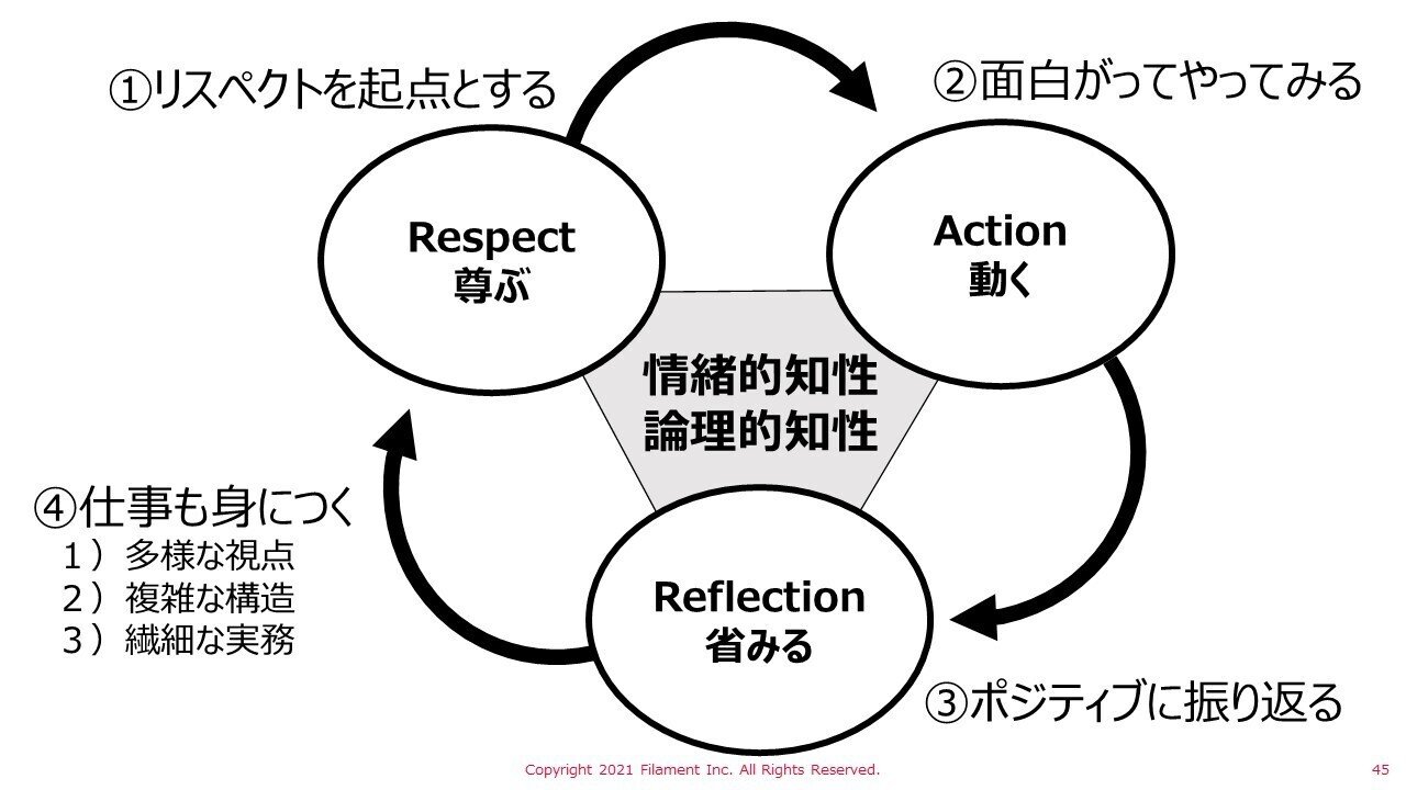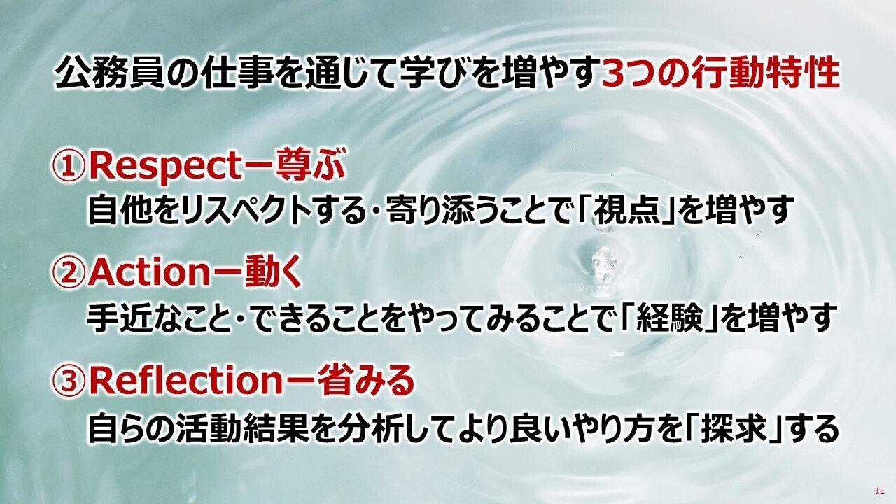 でも、公務員の仕事をしてたら誰でもクリエイティビティが身につくのかと言うと、残念ながらそうではないようにも思います。公務員の仕事を通じて学びを増やしていくためには、ある程度意識をして自分の行動特性を身に付けていくことが必要です。三つあるうちの一つ目が「リスペクト」です。「リスペクト」というと、他者に対しての経緯と思ってしまいますが、他者だけでなく自分に対しても同じです。二つ目は「アクション」です。手近なこと、できることを見つけてまずやってみると経験が増えます。三つ目は「リフレクション」、顧みることです。自らの活動の結果を分析してより良いやり方がないかを探求していくことです。これらを意識的に繰り返していくことで成長していきます。