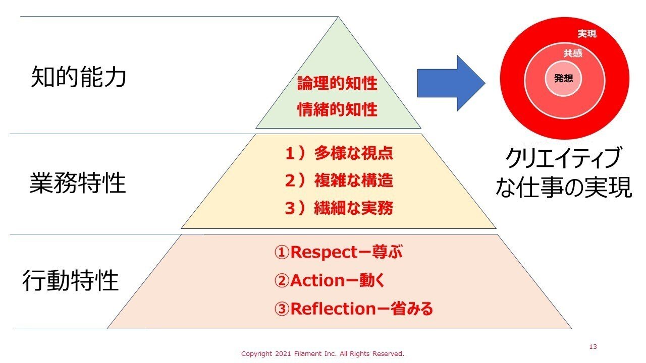 まず行動特性としてリスペクト、アクション、リフレクションがあり、これらをもって、多様な視点、複雑な行動、繊細な実務という特徴を持つお仕事を進めていく。そうすると、論理的知性、情緒的知性が高まって、結果的にクリエイティブな仕事を実現できるようになります。