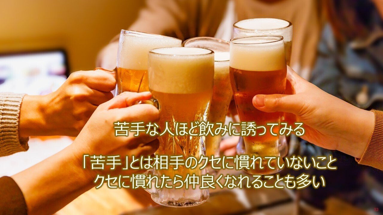若いころやっていた飲み会では「その場にいない人を褒めたたえる」ということをよくやっていました。その場にいる人を褒めたたえるとこびへつらっているみたいで気分が良くないですが、そうではなく、その場にいない人を褒めると清々しく飲めるし、酒も美味くなる。それに加え、「あの人はこんなことやってるから周りに感謝されてるんだな」ということもわかるんですよね。
