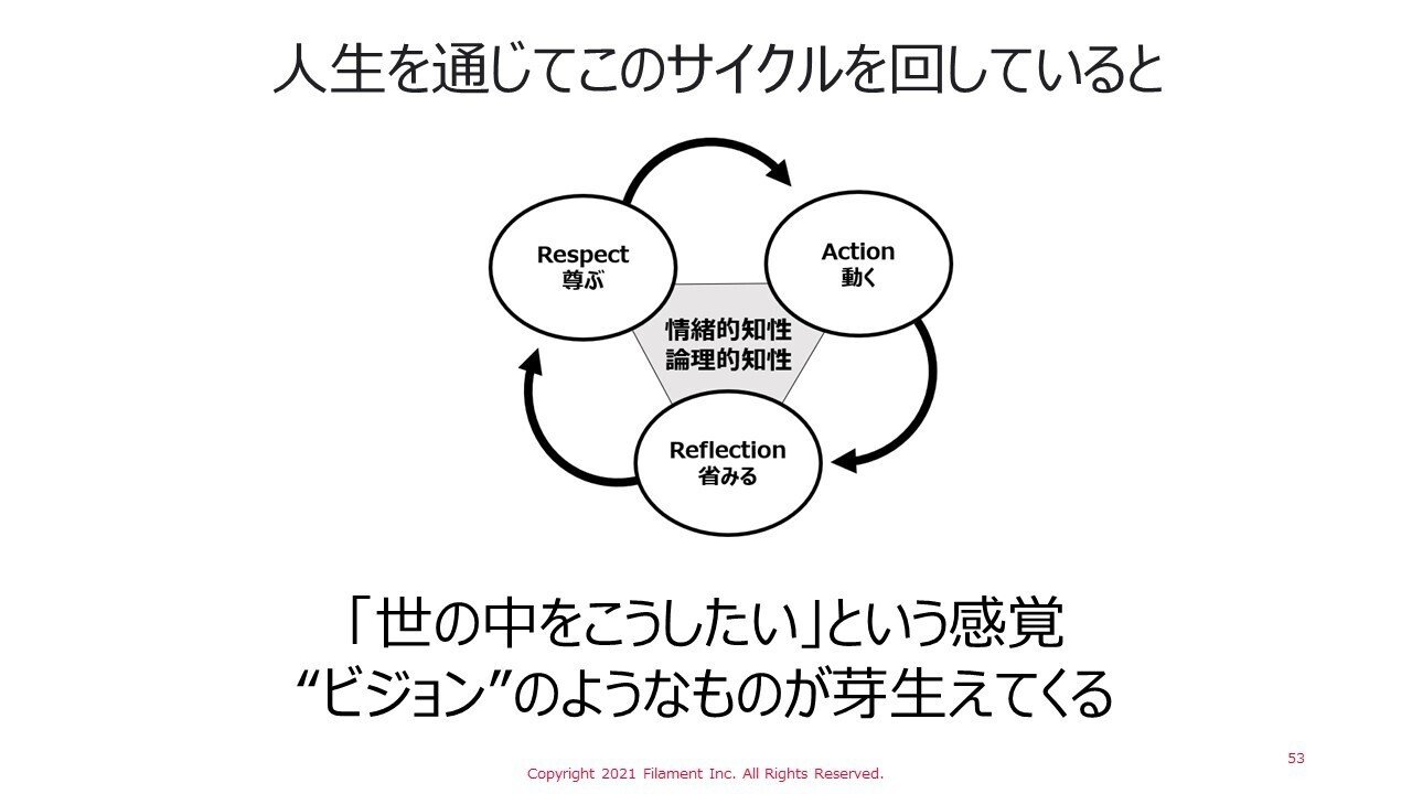 このように、人生を通じてリスペクト・アクション・リフレクションというサイクルを回していくと、徐々に世の中や自分の中の価値観が整ってきます。そして、世の中をどうしたいか、という感覚が自分の中で明確になってきたのです。これはまるで自分の辞書が増えるようなもので、どんな世界にしたいかというビジョンのようなものが徐々に芽生えてきました。