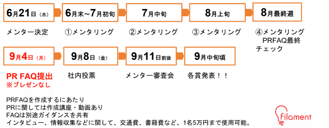 各社員は担当となった共創メンターとともに隔週で全4回メンタリングを受けアイデアを改良し、PRFAQ(A4一枚のプレスリリース形式のフォーマット)にまとめました。