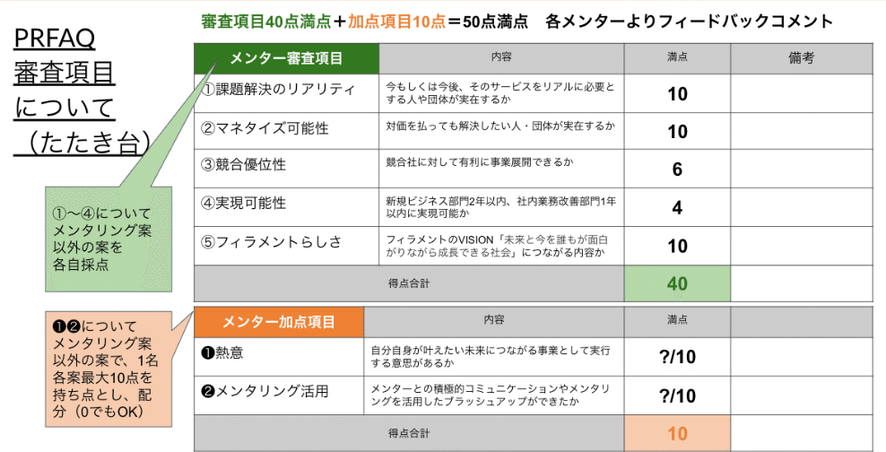 メンターの選定やプログラムの設計といった今回のビジコンの運営事務局業務は、フィラメントの業務にご協力いただいている株式会社キャントウェイトの平松葉月さんが担当しました。審査項目についても、平松さんが今回のビジコンの目的に合わせてたたき台を作り、審査を担当する共創メンターと話し合って修正しました。