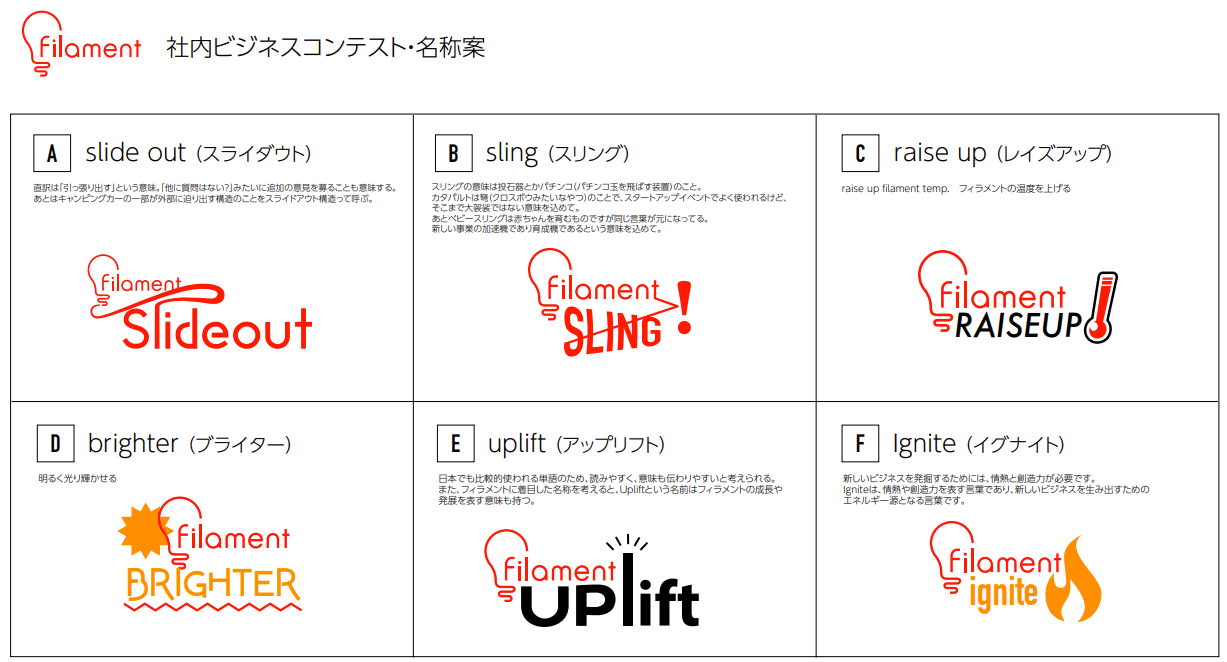 フィラメントの全員参加型ビジネスアイデアコンテスト「Uplift」は今回初の取り組みということもあって、その名前から新たに考える必要がありました。運営事務局を担当した平松さんが『フィラメント社内ビジネスアイデアコンテスト』だと愛着がわかないと感じ、フィラメントCEO角とビジコン発案者であるフィラメントCOO田中とともにいろいろな名前の案を検討して決定しました。また、グラフィックデザイナーとして活躍されていた平松さんは印象を一つにするためにロゴがあった方がいいと感じ、ロゴ案も同時に作成していました。E案が実際に採用されました。