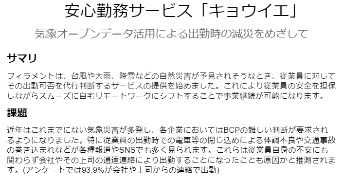 例えば、応募されたアイデアの一つ「安心勤務サービス『キョウイエ』」のPRFAQを部分的に引用すると以下のようになります。プレスリリースを模したフォーマットなので、冒頭はタイトル、サマリが並び、解決したい課題と続きます。
