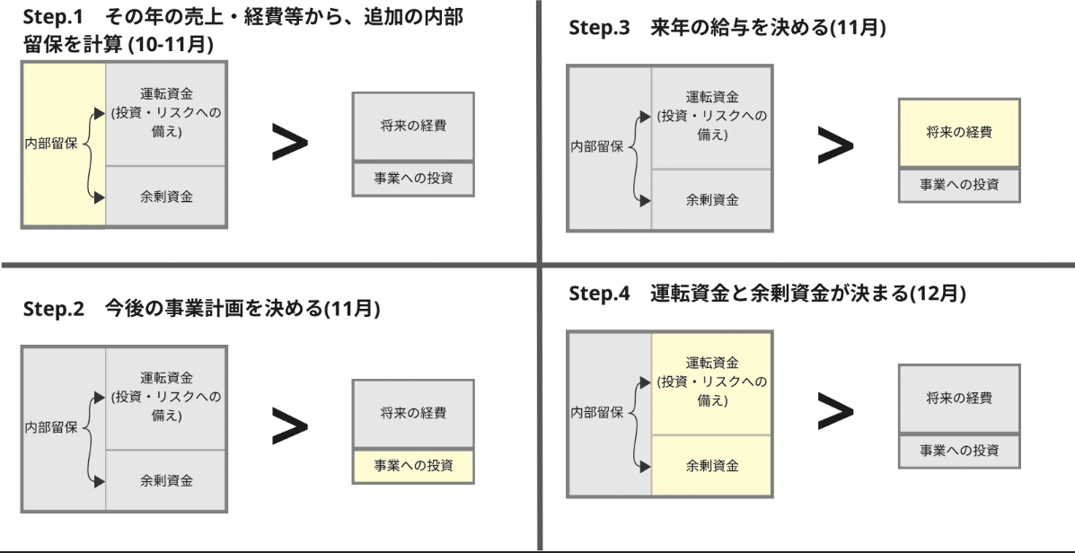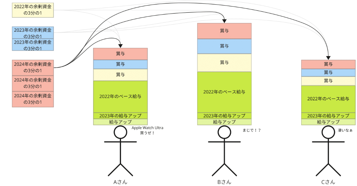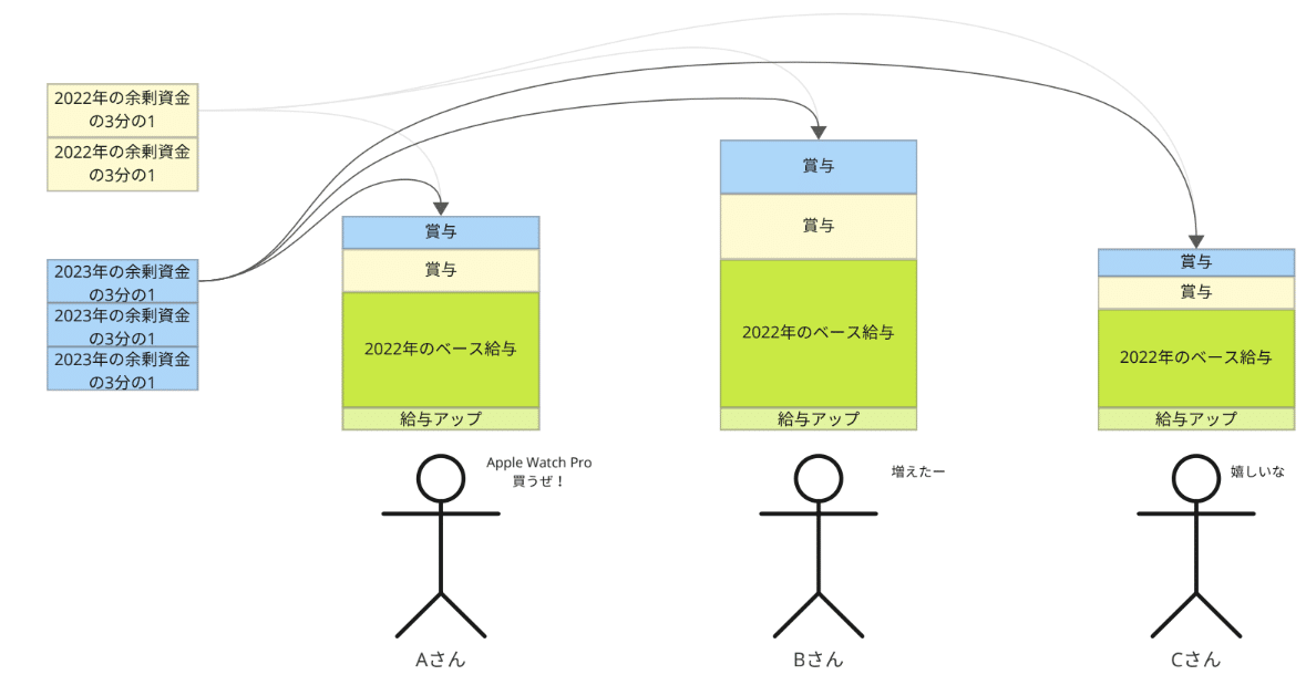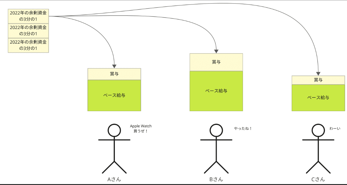単純に賞与が「基本給の〇ヶ月分」で算出されるのではなく、業績に由来する余剰資金から算出して配られるのが面白いですね。