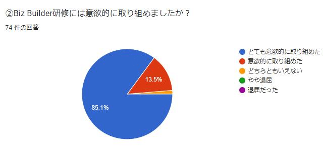 この研修について、意欲的に取り組めたかを5段階で尋ねたところ、実に「とても意欲的に取り組めた」「意欲的に取り組めた」を合わせると、こちらも98.6%の方が意欲的に取り組めたとのこと!当日会場はどのテーブルも盛り上がっていましたから、この評判も理解できます。
